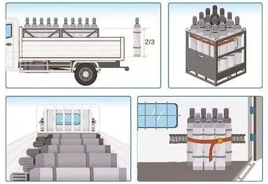 ②气瓶装载车上应妥善加以固定 。横放时,头部应朝向一方,且与行驶方向垂直,垛高不得超过车厢高度,且不超过五层;立放时,车厢高度应在瓶高的三分之二以上。
